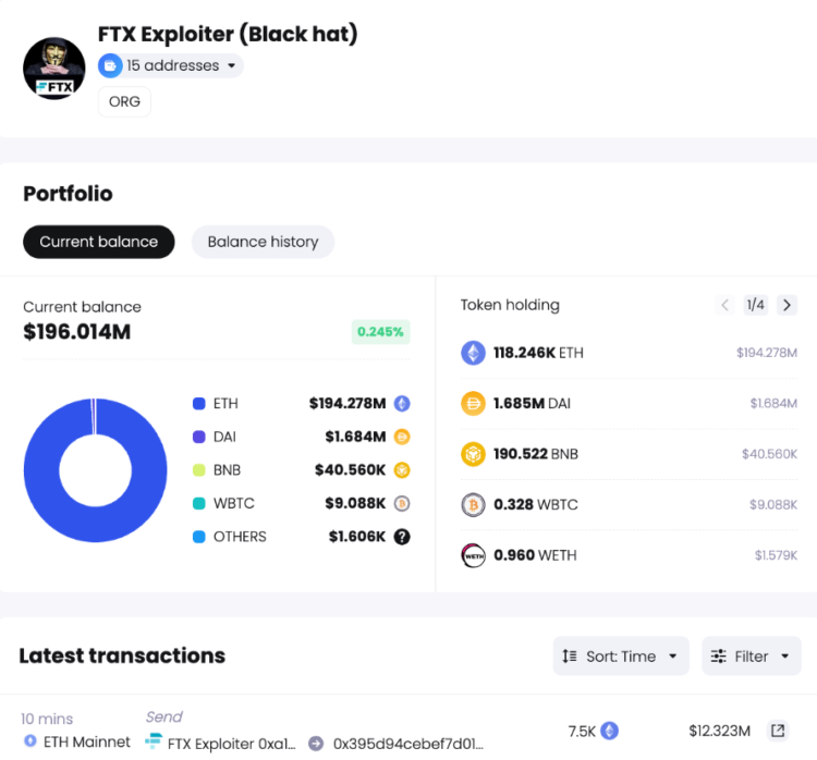 FTX exploiter's wallet address transferred approximately $36.8 million worth of Ether in the wake of Sam Bankman-Fried's (SBF) court trials, bringing the current balance in their portfolio down to $196.014 million after a series of transfers.