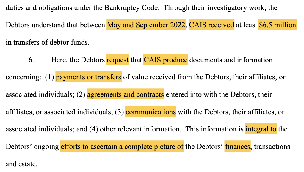 FTX seeks approval from a Delaware Bankruptcy Court judge to issue subpoenas to CAIS inquiring whether it received payments, funds, communications, or entered into agreements or contracts with FTX, its affiliates, or former executives.