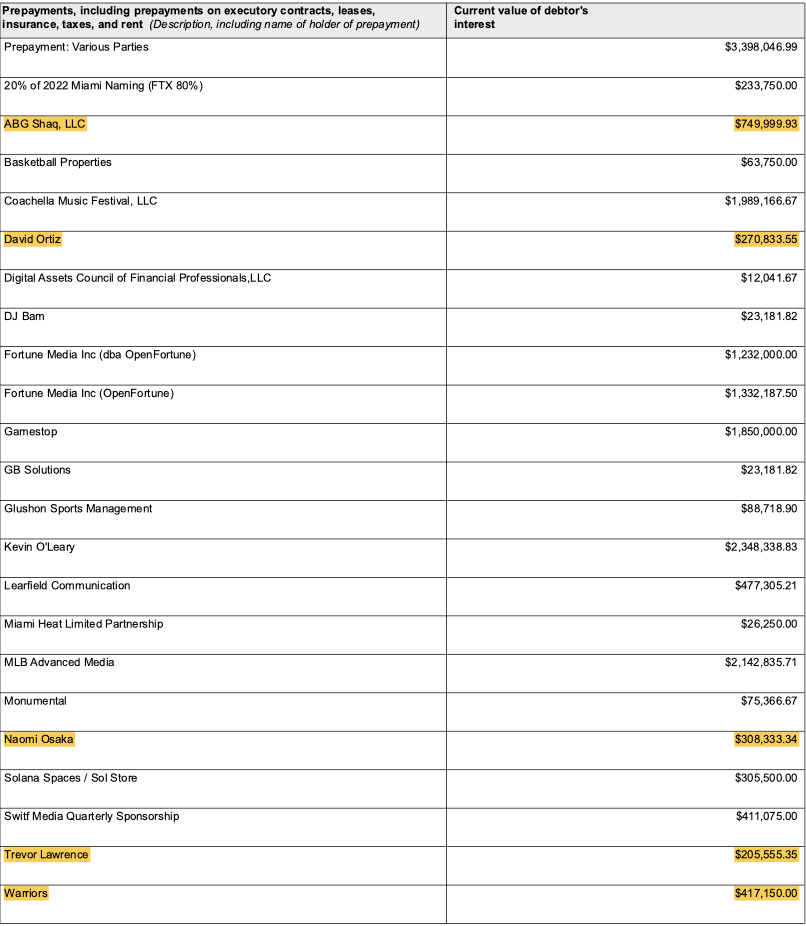 FTX listed the millions it paid to celebrities such as Shaquille O'Neal, Naomi Osaka, and others that it hopes to recover.