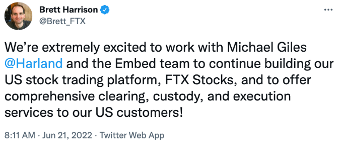 FTX Stocks partnered with Embed Clearing to “execute, clear, and custody” user accounts and trades, following the crypto firm's announcement in May that it will establish a stock trading platform.