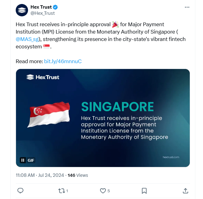 Hex Trust, a digital asset custodian, has announced that it has received in-principle approval from the Singapore financial regulator for a major payment institution (MPI) license.