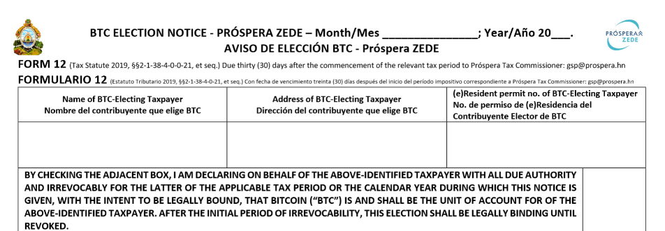 Those wishing to designate BTC as their unit of account must notify the Próspera's tax commission in writing within thirty days of the applicable tax period.