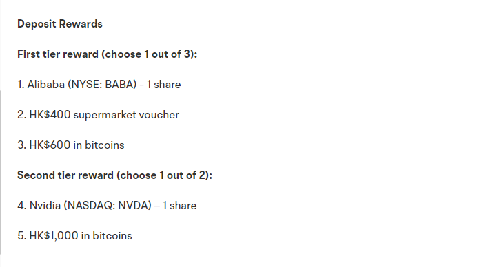 Three rewards are available to participants: a share of Alibaba, a HK$400 ($51) supermarket voucher, or HK$600 ($76) in Bitcoin. It will take ten trading days to issue or credit the rewards to the account 60 days after the event concludes.