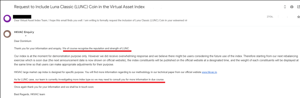 The HKVAC team responded that it recognizes Terra Luna Classic's reputation and capabilities and its connections to the cryptocurrency exchange Binance. The HKVAC considerable market value index is created for a specific purpose, and index constituents will be published on July 14 on the official website. In addition, the HKVAC team is contemplating additional index types and will consult the Terra Classic community for further information.