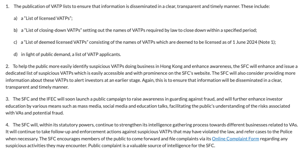 The SFC stated that it will also maintain an inventory of “suspicious VATPs,” accessible and prominently displayed on the regulators' website.