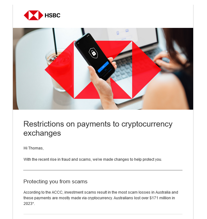 HSBC Australia blocks customer payments to crypto exchanges, citing scam protection.