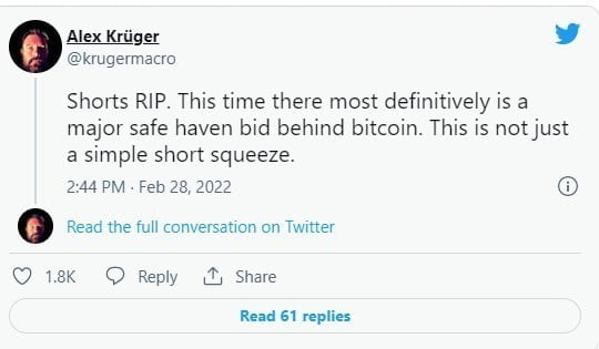 According to Coinglass data, almost $68 million in short positions in the world's largest cryptocurrency were liquidated in the last 24 hours. In the last week, attitudes toward cryptocurrency have improved as a result of Western sanctions and conflict disturbances in Ukraine and Russia.