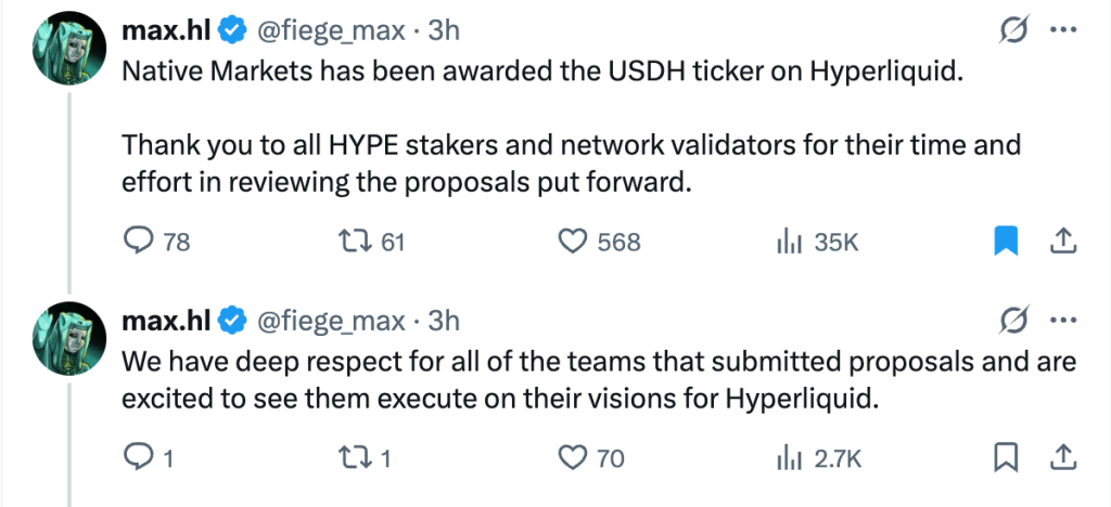 Native Markets, co-founded by early Hyperliquid advocate Max Fiege, confirmed its win on Sunday. The team will now deploy the first Hyperliquid Improvement Proposal (HIP) for USDH and launch the ERC-20 version of the stablecoin.