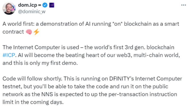 As a smart contract on the Internet Computer, DFINITY CEO Dominic Williams uploaded a video to X on March 22 that he claimed to be the first of its kind: “quite a sophisticated AI running on the blockchain.”