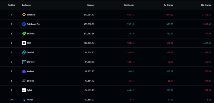 Binance ranks first on the list with 543,281 BTC, but the exchange has experienced significant Bitcoin withdrawals over the past 30 days, with 21,645 BTC withdrawn.