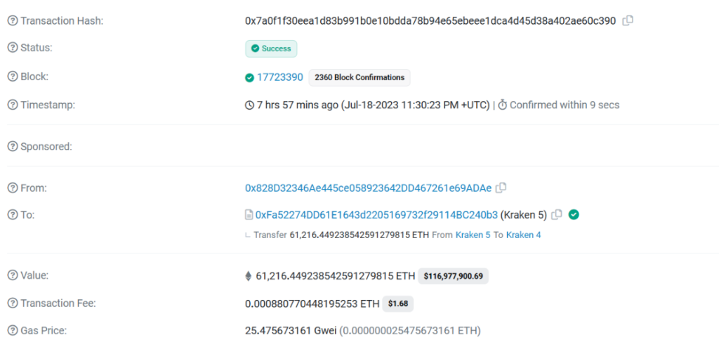 The pre-mined 61,216 ETH were transmitted to a Kraken wallet address on July 18 at 7:30 p.m. Eastern Time, according to Etherscan data. As shown in the screenshot below, sending $116 million in Ether required a negligible transaction charge of $1.5 and 25.475673161 gwei in gas price.