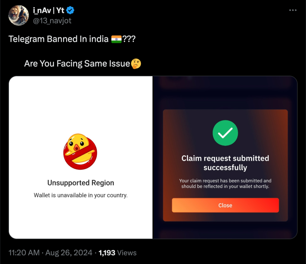Nevertheless, Infinity Hedge and a user named Sarvesh have reported that other users are still able to access the Telegram wallet in India.