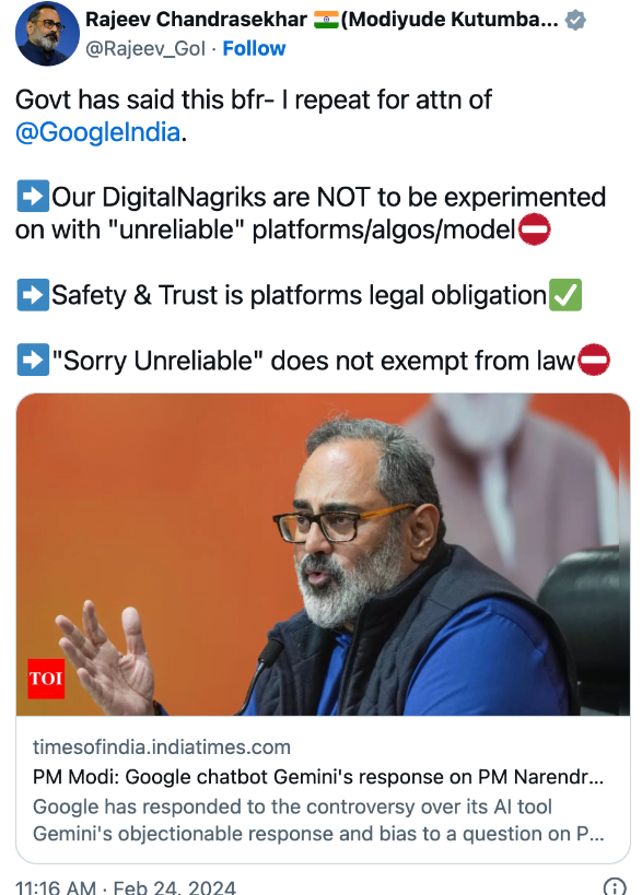 The deputy IT minister of India, Rajeev Chandrasekhar, stated on X: “Safety and trust are the legal obligations of [a platform].” “Sorry Unreliable” is not a legal exemption.”