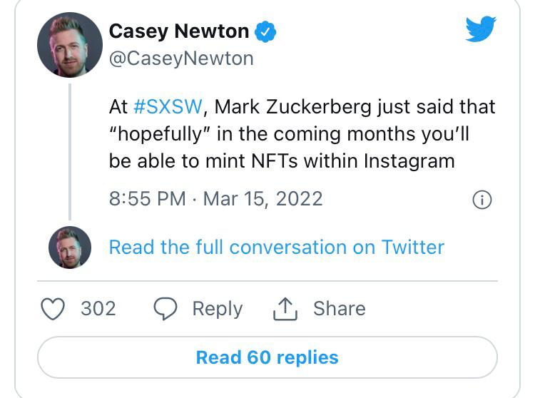 From the conference, Casey Newton, a contributor for the Platformer newsletter, tweeted that Zuckerberg also said he expects Instagram users will be able to mint their own NFTs in the coming months.