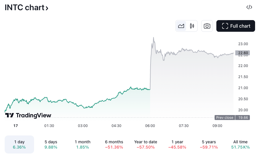 According to TradingView data, Intel shares surged from $19.86 at the market opening to $23.30 in after-hours trading, resulting in a 6.4% increase in the day's performance.