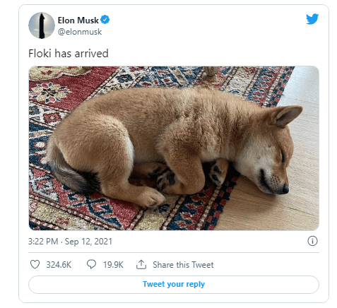 Musk announced the arrival of Floki in a Twitter post on Sept. 12 after announcing in June that he was getting a Shiba Inu puppy, the Dogecoin currency's symbol.