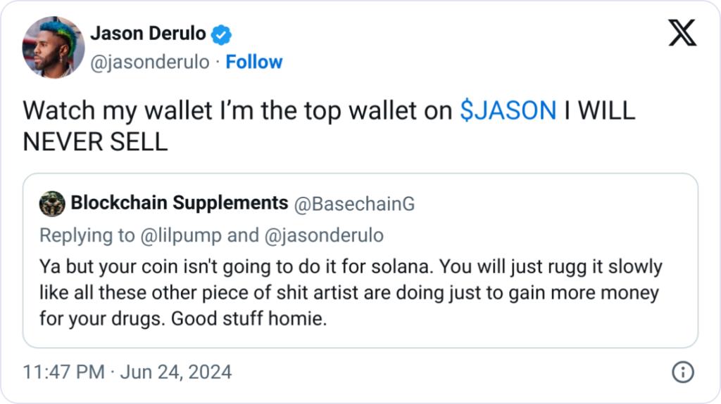 It claimed to have found wallets linked to Arora that held half of JASON's supply. These wallets “dumped almost everything” and made $180,000 after Derulo's first post sharing the token.