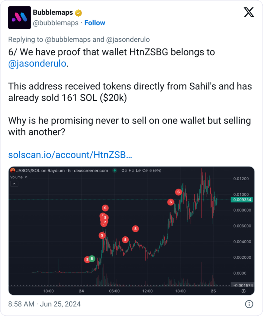 Bubblemaps wrote on X on June 24: “Despite what he says, we doubt Sahil was able to trick Jason Derulo.”