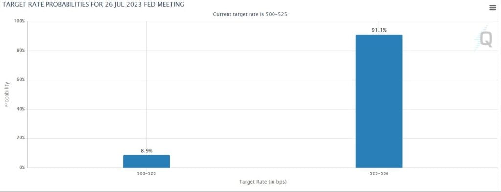 This suggests that the Fed may implement two additional quarter-point hikes during its final four meetings for the year. According to the CME FedWatch Tool, the probability of a quarter-point rate increase in July is 88.7% as of approximately 21 days before the next meeting.