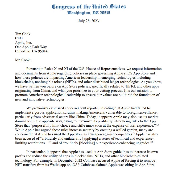 United States Representatives Gus Bilirakis and Jan Schakowsky penned a formal letter to Apple CEO Tim Cook about concerns related to the California-based company's App Store, and the potential effect of its guidelines on emerging technologies like blockchain and NFTs.