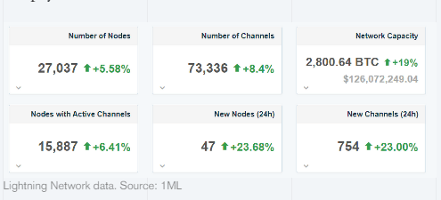 According to current data from 1ML, there are a total of 27,037 Lightning nodes online, with 15,887 of them containing active payment channels. Over the course of the day, the number of new channels climbed by 8.4%, reaching a total of 73,000.