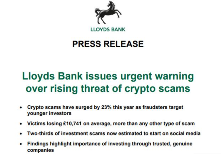 Lloyds Bank Reports Cryptocurrency Scams Soars 23% in UK