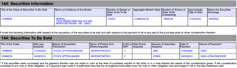 Saylor disclosed in a filing with the United States Securities and Exchange Commission dated January 2 that he had commenced the sale of the 315,000 stock options initially allocated to him in April 2014. The options on the issued stock will expire on April 30, 2024.