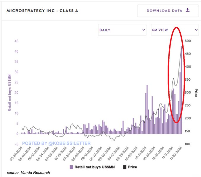 Last Wednesday, retail investors purchased around $42 million worth of MSTR shares, marking the highest single-day purchase in the company’s history, according to The Kobeissi Letter.