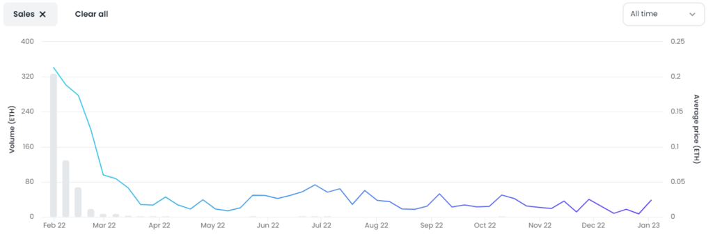 As of February 2022, its value exceeded 320 Ether ETH in sales volume, which experienced a substantial decline by April 2022, a span of two months.