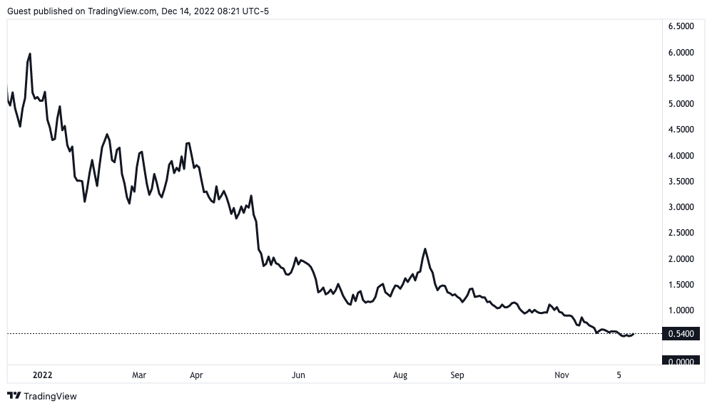 Bitfarms' shares fell below $1 in late October 2022, according to TradingView data, and haven't tested the $1 price level since. On December 13, the bitcoin mining firm's stock finished at $0.54, up 7.6% on the day.