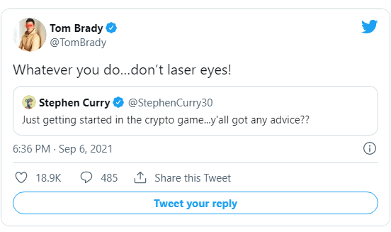 Brady's image featured the notorious Laser eyes, a popular meme used by the crypto community, politicians, athletes, and other significant business personalities to proclaim their support for major crypto-asset Bitcoin earlier this year (BTC).