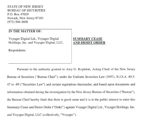 New Jersey Bureau of Securities has issued Voyager Digital a cease and desist order for marketing unregistered securities through its Voyager Earn program in the United States