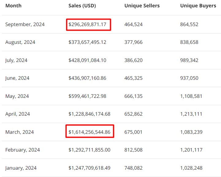 This is a 20% decline from the sales volume of $373 million reported in August. Compared to the sales volume of $1.6 billion in March, the peak month for digital collectibles in 2024, this result signifies an 81% decrease.