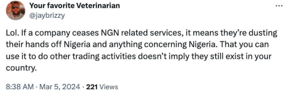 A comment regarding Binance removing NGN transactions. Source: Jaybrizzy on X.