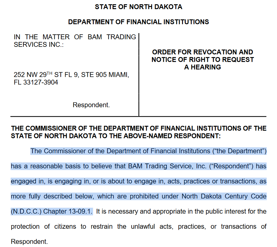 BAM Trading Services has requested the renewal of a money transmission license from North Dakota, the seventh state, to revoke or deny the request. In recent months, Alaska, Florida, Maine, North Carolina, and Oregon have implemented comparable measures.