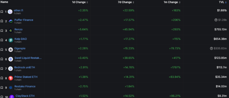 The worth of Ether in the $600 million is equivalent to 33% of the total Ether.Fi supply.The locked-in total value (TVL) of Ether.Fi is $1.88 billion. DefiLlama data indicates that Ether.Fi is the largest liquid restaking protocol in the world at present, as its TVL increased by more than 163% in the past month.