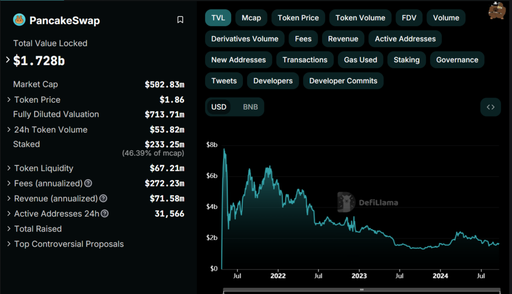 After four years, PancakeSwap has achieved $836 billion in cumulative trading volume and a total value locked (TVL) of approximately $1.72 billion.