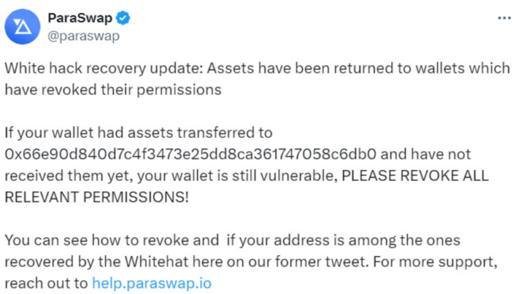 “Actively engaged in identifying hacker addresses and tracing the movement of the funds,” ParaSwap states in close collaboration with blockchain analytics and security firms Chainalysis and TRM Labs.