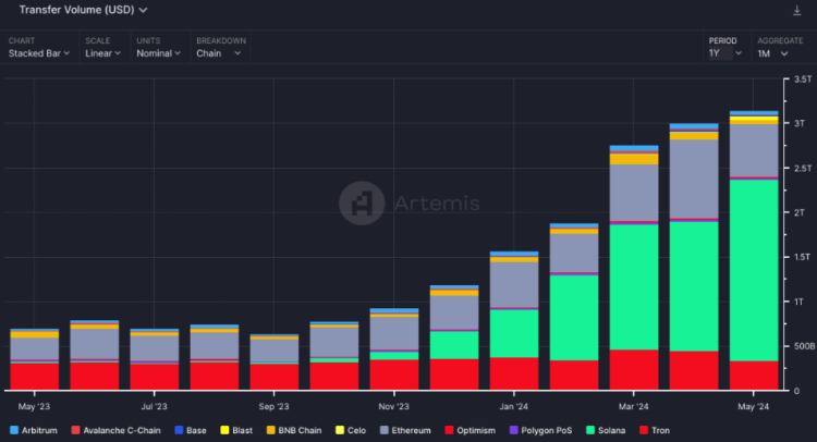 Since the previous year, the Solana network has become the most popular blockchain for stablecoin transfers. Artemis, an analytics platform, reports that the volume of stablecoin transfers on Solana amounted to $1.5 trillion in the preceding year, significantly exceeding Ethereum's volume of $885 billion during the same time frame.