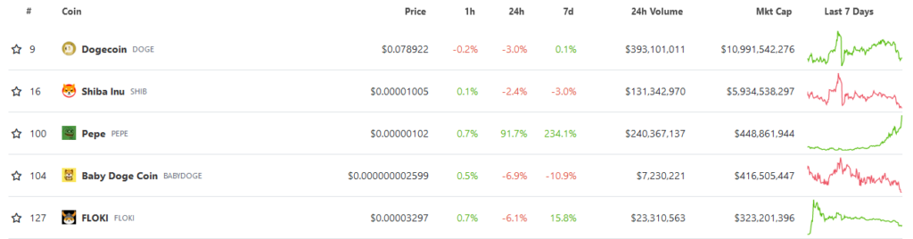 Despite the market slump, Pepe has overtaken FLOKI and Baby Doge Currency to become the third-largest meme coin by market capitalization.