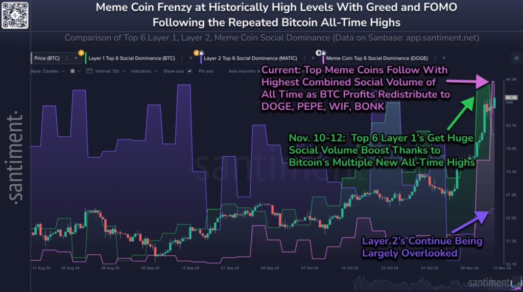The meme coin frenzy, on the other hand, has been at a historically high level, with greed and fear of missing out (FOMO) catching up quite soon, according to the data that Santiment has on the blockchain.