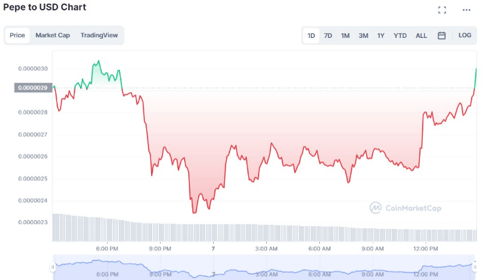 At the time of writing, the PEPE price has begun regaining momentum despite the losses incurred, as evidenced by a decline in trading volume of more than 56%. The token trades at $0.000002991, representing a marginal increase of 1.35 percent over the past 24 hours.