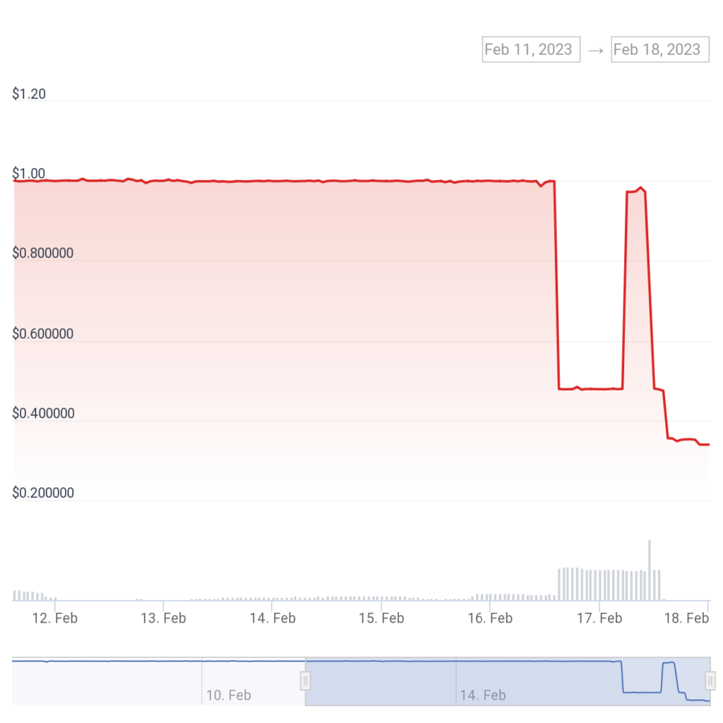 The Platypus USD (USP) stablecoin depegged from the U.S. dollar as a result of the over $8.5 million that was removed from the protocol, falling to $0.33 at the time of writing.