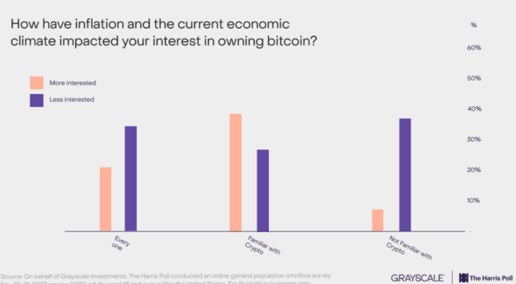 Inflation and the current state of the economy prompted approximately 40% of those already acquainted with cryptocurrencies to say they would be “more interested” in Bitcoin ownership. Conversely, the corresponding percentage of those unfamiliar with cryptocurrencies stated they would be “less interested.”