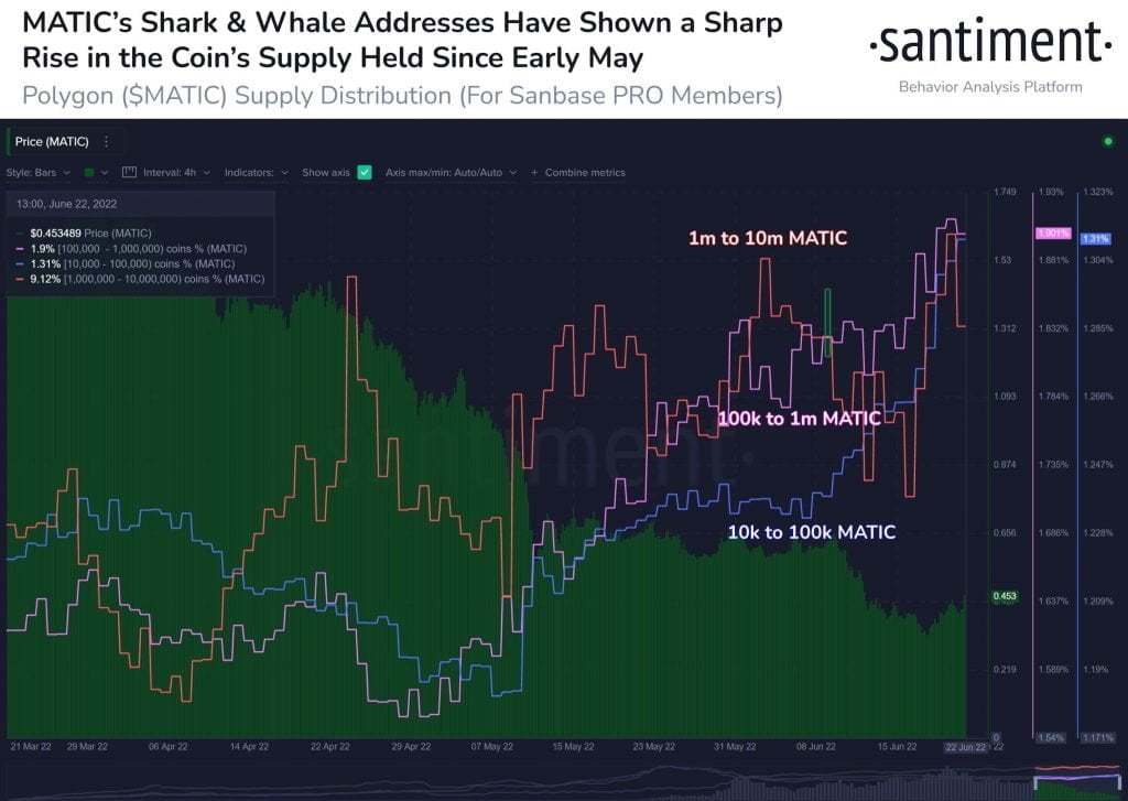 “MATIC sharks and whales have been in a pretty big accumulation trend for about six weeks. The tiers of holders ranging from 10k to 10m coins held have collectively added 8.7% more to their bags in this timespan.”