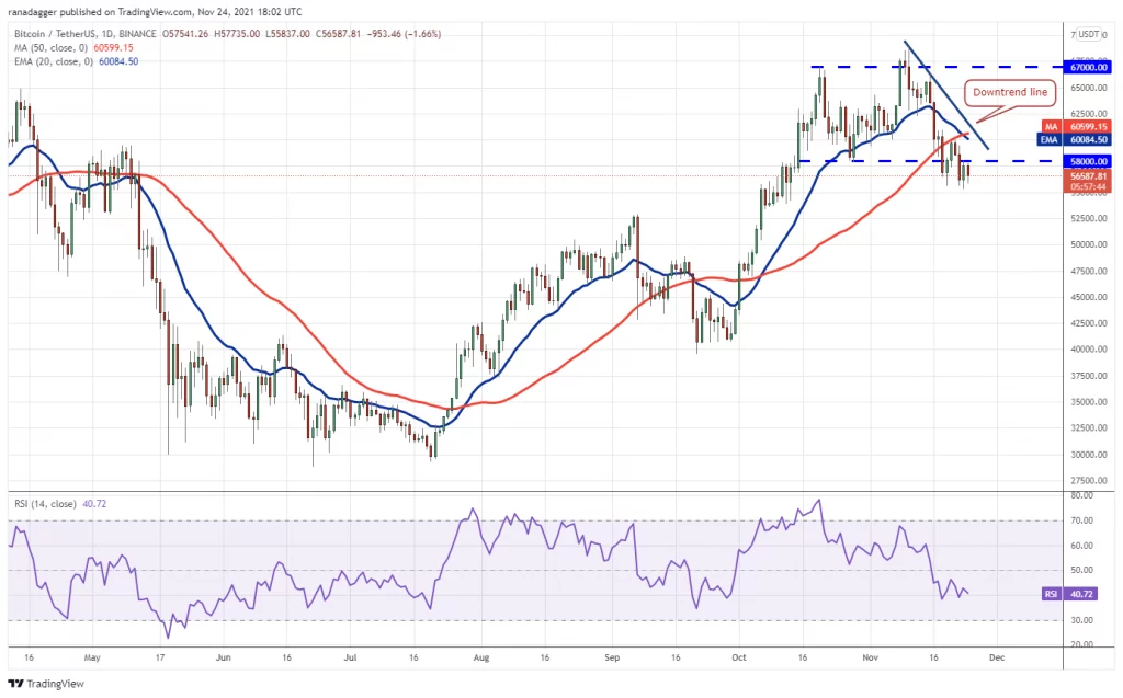 The bulls are attempting to halt the correction near $55,000, but the bears are unyielding. Bitcoin's relief rally on November 23 reversed from $58,000, indicating that bears are attempting to convert this level into resistance.
