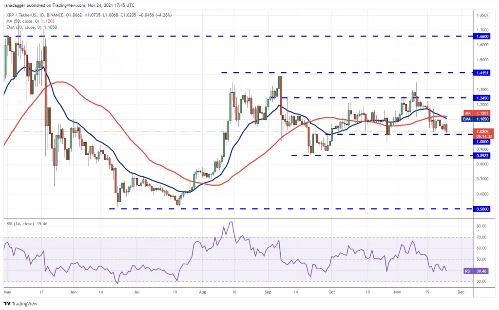 On Nov. 23, XRP recovered from psychological support at $1, but the bulls were unable to push the price to the 20-day EMA ($1.10). The modest bounce suggests that bears will continue to sell on any minor relief rally.