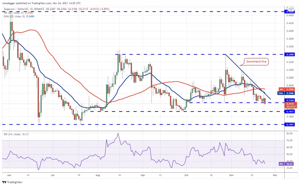 On November 23, Dogecoin (DOGE) recovered off the important support level of $0.21, but the lengthy wick on the day's candlestick implies that bears are still selling along the downtrend line.