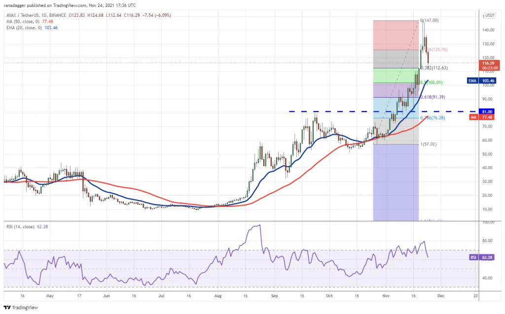 The AVAX/USDT pair has begun a pullback that should find solid support between the 38.2% Fibonacci retracement level at $112.63 and the 20-day EMA ($103).