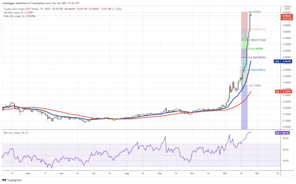 For the past few days, Crypto.com Coin (CRO) has been on a strong upswing. The vertical rally has pushed the RSI near to 90, indicating that the rally is currently overheated. For a few days, this could result in a mild correction or consolidation.